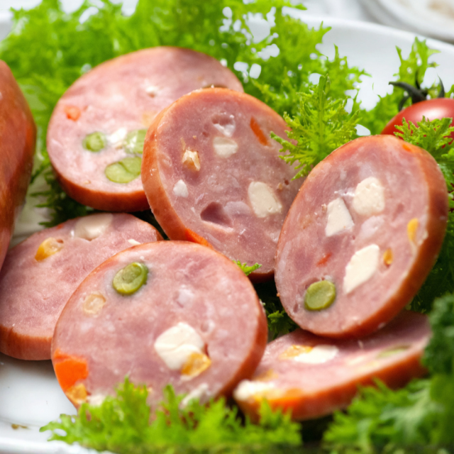 佐賀県産の豚肉100%を使用した、荒挽きウィンナー生地にチーズとミックスベジタブルを練りこみました。まるで宝石のように美しく輝くチーズと、野菜がゴロゴロと入った彩り豊かな宮地ハムオリジナルのリオナソーセージは、1品でもおかずになる、おつまみにも最適なソーセージです。