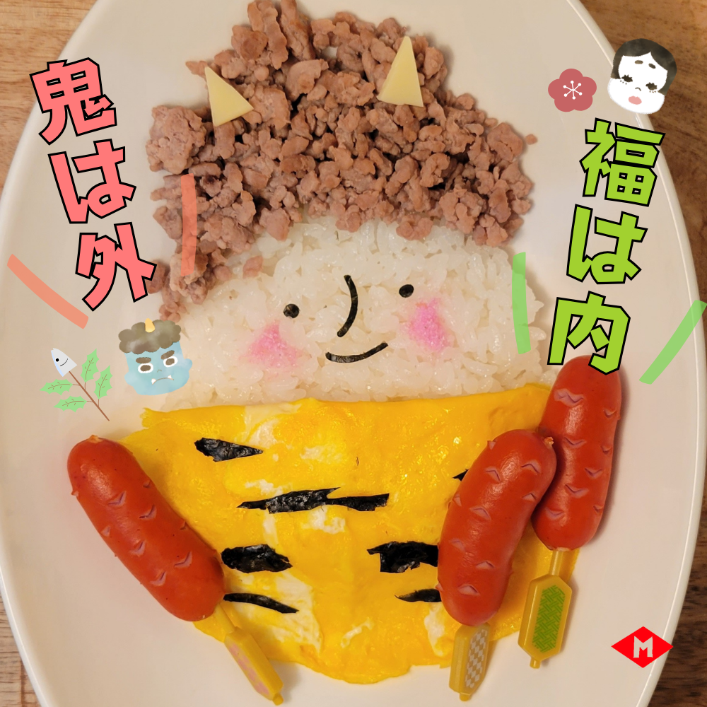 節分の日にもってこい!鬼の頭は豚ミンチを使用し、鬼さんの金棒に赤ウインナーを使いました(^^)見た目もかわいくて栄養満点食な節分レシピ💛ぜひお試しください♬